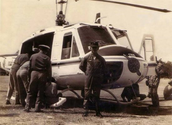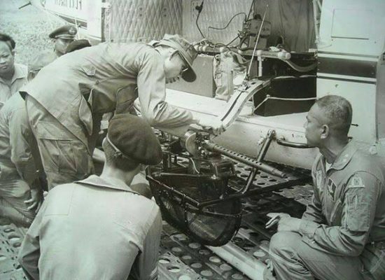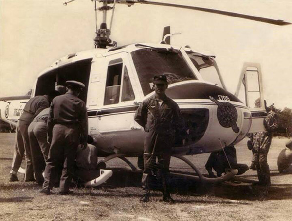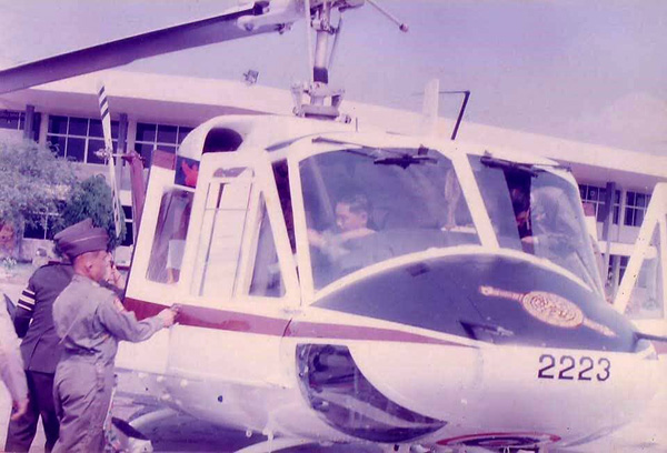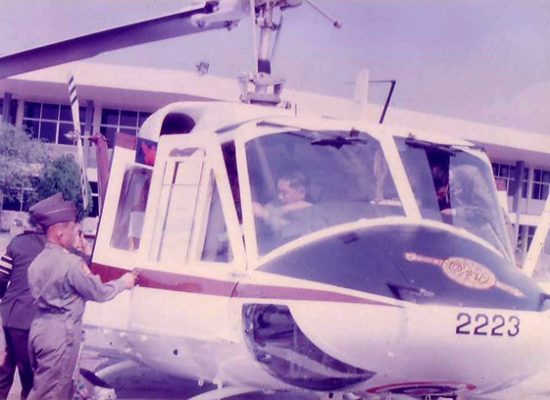 ภาพชุดนี้เป็นภาพเมื่อวันที่ 21 สิงหาคม 2513 โดยหนังสือพิมพ์ในเวลานั้น รายงานข่าวว่า “พระบาทสมเด็จพระเจ้าอยู่หัว พร้อมด้วย สมเด็จพระนางเจ้าฯ พระบรมราชินีนาถ ได้เสด็จฯ โดยรถยนต์พระที่นั่งจากพระราชวังไกลกังวล หัวหิน ไปยังค่ายนเรศวร เพื่อทรงทดลองปืนกลติดเฮลิคอปเตอร์ที่ดำเนินการติดตั้งใหม่อีก 2 กระบอก โดยมี พ.ต.อ.พิชิต ลักษณาเวช ผู้บังคับการกองบินตำรวจ ได้รับเสด็จฯ จากนั้นทั้งสองพระองค์ได้เสด็จฯ ขึ้นเฮลิคอปเตอร์พระที่นั่ง มี ร.ต.ท.ป้อมเพชร นาคธน เป็นนักบินที่ 1 และ ร.ต.ท.สมุทรชัย คุ้มประพันธ์ เป็นนักบินที่ 2