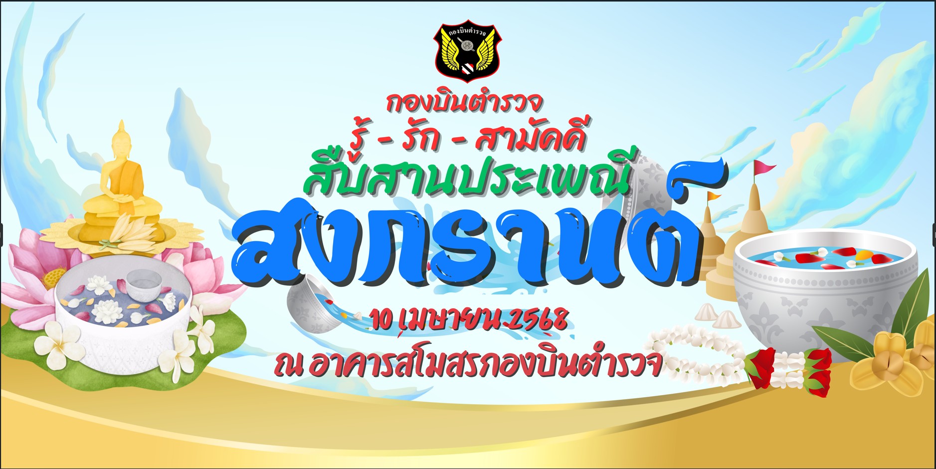 เมื่อวันพฤหัสบดีที่ 10 เมษายน 2568 กองบินตำรวจ ได้จัดกิจกรรมประเพณีวันสงกรานต์ (รดน้ำดำหัวผู้บังคับบัญชา) ให้กับข้าราชการตำรวจในสังกัด บ.ตร.