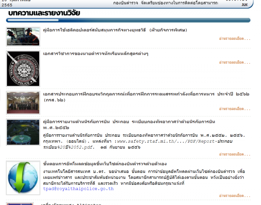 คณะกรรมการเทคโนโลยีสารสนเทศ บ.ตร. ขอเรียนเชิญข้าราชการตำรวจและบุคคลทั่วไป ร่วมส่งบทความ,เอกสารวิจัยด้านการบินและนวัตกรรม เพื่อลงเผยแพร่ในสื่อของกองบินตำรวจ ในการพัฒนาองค์กรจัดการความรู้ และส่งเสริมการเป็นองค์กรมืออาชีพที่มีประสิทธิภาพ ผู้สนใจสามารถส่งไฟล์ผ่านช่องทางอิเลคทรอนิกส์ ได้ที่ http://tpad.police.go.th/complain-76.html และสามารถเยี่ยมชมผลงานวิจัย/บทความที่เกี่ยวข้อง ที่ http://tpad.police.go.th/dynamic-7.html
